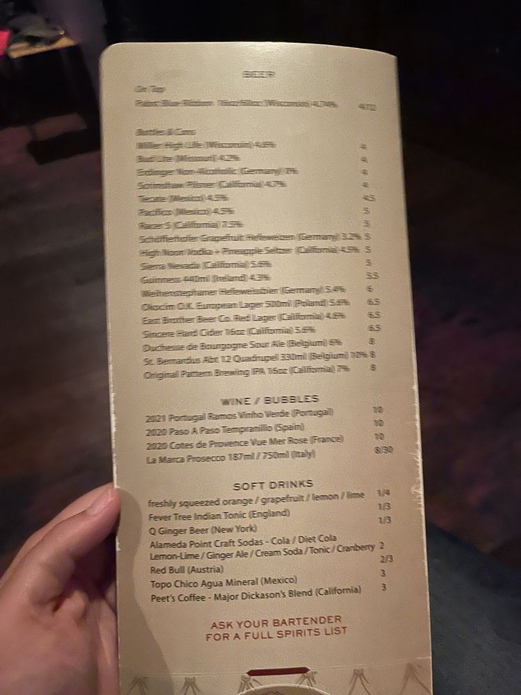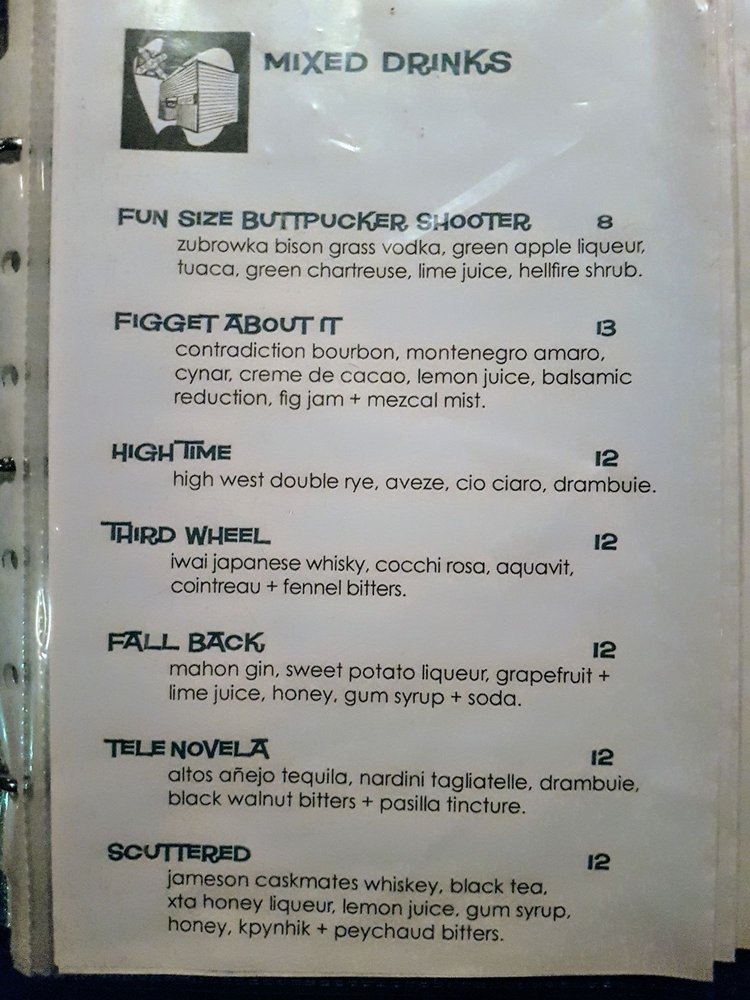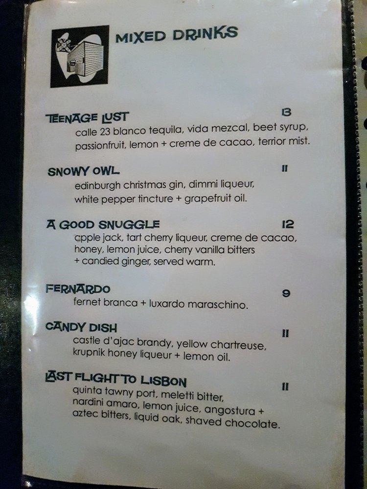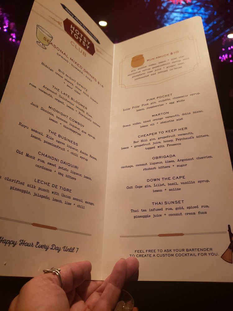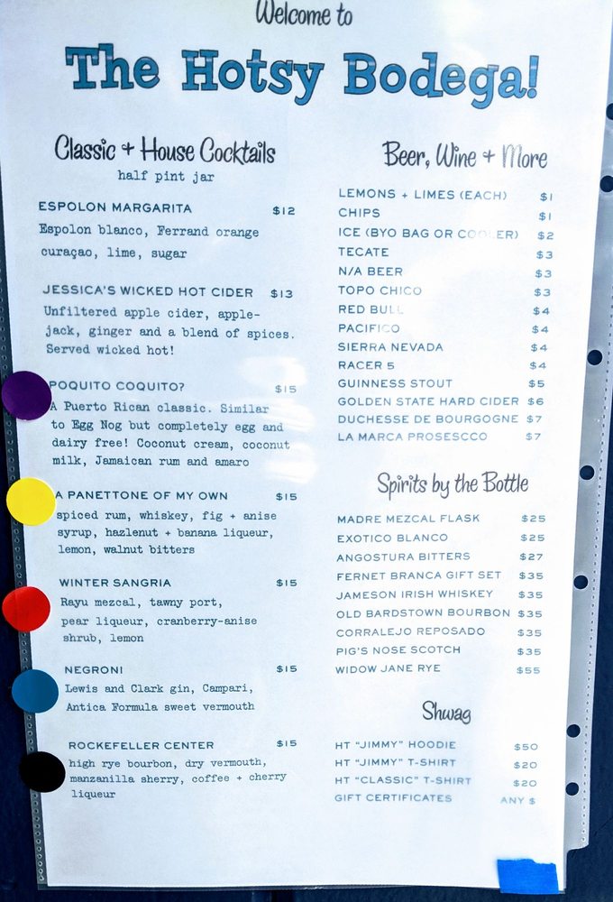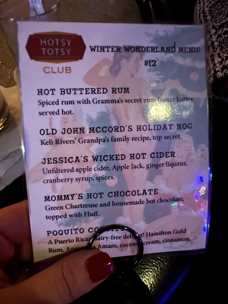 Introducing the menu at Hotsy Totsy Club, a cozy lounge and cocktail bar in Albany, CA. Known for their unique and flavorful house specialties, such as the Wicked Good with pisco and lemon over cucumber ice, and the Mexican Velvet with a blend of reposado and mezcal, every drink is crafted to perfection. The Fall/Winter specialties like Hot Totsy and Via Copenhagen offer a warm and spicy twist, while classic cocktails like the Negroni and Sazerac showcase the bartenders' skill and creativity. With a diverse range of options, including Latinx and women-owned classics, happy hour specials, and a welcoming atmosphere perfect for groups and solo visitors alike, Hotsy Totsy Club is a must-visit destination for cocktail enthusiasts looking for a fun and vibrant experience.
